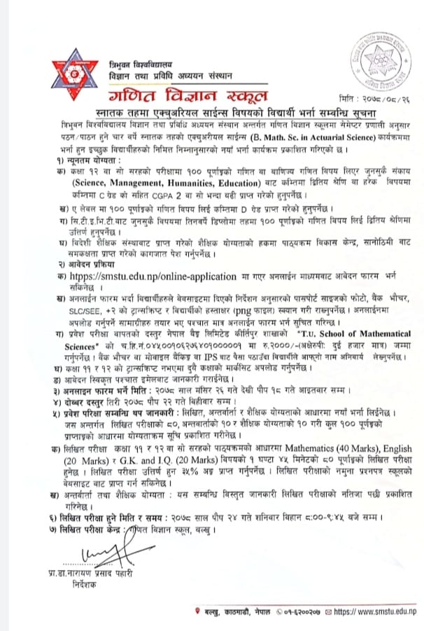 काठमाडौं । गणित विज्ञान स्कुलले सर्वाधिक कमाइ हुने रोजगारीको क्षेत्र एक्चुअरिअल साईन्समा भर्ना खुलेको छ । त्रिभुवन विश्वविद्यालय विज्ञान तथा प्रविधि अध्ययन संस्थान अन्तर्गत गणित विज्ञान स्कुलमा सेमेस्टर प्रणाली अनुसार पठन/पाठन हुने चार वर्षे स्नातक तहको एक्चुअरीयल साईन्स कार्यक्रममा भर्ना खुलेको हो । योग्यता पुगेका विद्यार्थीले अनलाइन मार्फत मंसिर २६ गतेदेखि पौष १८ गतेसम्म फारम भर्न सक्ने छन् । दोब्बर दस्तुर तिर्नेहरुले भने पुष २२ गते बिहीबारसम्म भर्न सक्ने छन् ।