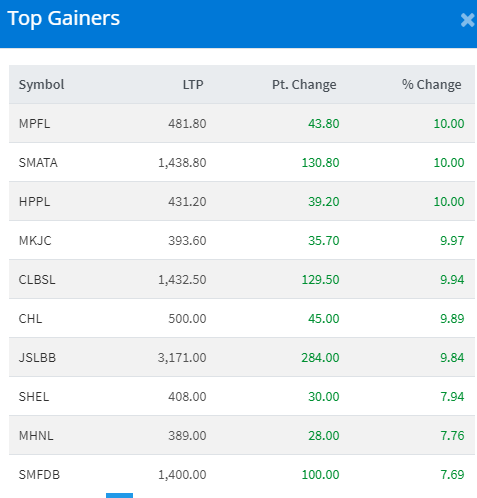 आज सबैभन्दा धेरै मल्टिपर्पोस फाइनान्स, समता घरेलु लघुवित्त र हिमालयन पावर पार्टनरका लगानीकर्ताले कमाएका छन् । कम्पनीका लगानीकर्ताले १० प्रतिशतका दरले कमाएका छन् । मैलुङ खोलाका लगानीकर्ताले ९ दशमलव ९७ प्रतिशतका दरले कमाएका छन् । सिभिल लघुवित्तका लगानीकर्ताले ९ दशमलव ९४ प्रतिशतका दरले कमाएका छन् ।