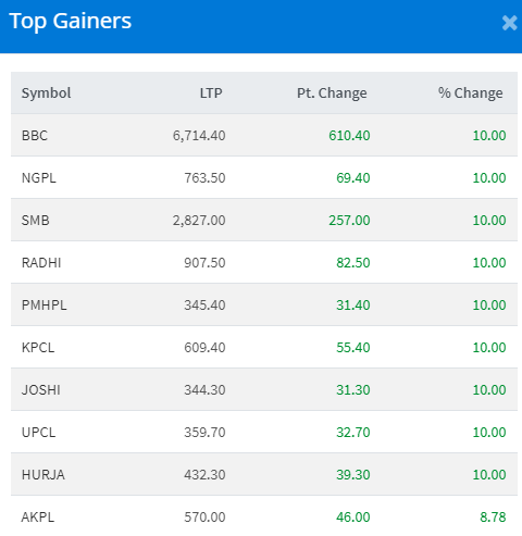 आज सबैभन्दा धेरै विशाल बजार कम्पनी, नाङदी ग्रुप, सपोर्ट माइक्रोफाइनान्स, राद्यी विद्युत कम्पनी, पञ्चकन्यामाई हाइड्रोपावर कम्पनी, कालिका पावर कम्पनी, जोशी हाइड्रोपावर कम्पनी, यूनिभर्सल पावर कम्पनी र हिमालयन उर्जा विकास कम्पनीका लगानीकर्ताले सर्वाधिक कमाएका छन् । यी कम्पनीका लगानीकर्ताले आज १० प्रतिशतका दरले कमाएका हुन् ।