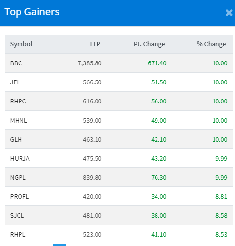 आज सबैभन्दा धेरै विशाल बजार कम्पनी, जानकी फाइनान्स, रिडी हाइड्रोपावर कम्पनी, माउन्टेन हाइड्रो कम्पनी र ग्रिन लाइफका लगानीकर्ताले कमाएका छन् । आज यी कम्पनीका लगानीकर्ताले १० प्रतिशतका दरले कमाएका छन् । त्यस्तै, हिमालयन उर्जा विकासका लगानीकर्ताले ९ दशमलव ९९ प्रतिशतका दरले कमाएका छन् ।