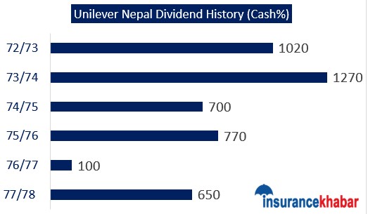 विगत वर्ष वर्षको अवधिमा कम्पनीले वितरण गरेको लाभांशलाई हेर्ने हो भने आर्थिक वर्ष २०७३/७४ मा सर्वाधिक धेरै १२७० प्रतिशत नगद लाभांश दिएको पाइन्छ । यस वर्ष कम्पनीले २५ वर्ष पुरा भएको अवसरमा आकर्षक लाभांश दिएको थियो । कोभिड १९ को प्रभावका बावजुत पनि कम्पनीले यस वर्ष ६५० प्रतिशत नगद लाभांश दिएको छ । तर गत वर्ष कम्पनीले इतिहासकै सर्वाधिक कम १०० प्रतिशत लाभांश दिदा शेयर मूल्यमा भारि गिरावट आएको थियो ।