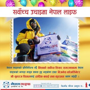 काठमाडौं । नेपाल लाइफको प्रतिनिधित्व गर्दै कम्पनीका विजनेस कोअर्डिनेटर युवराज धितालले विश्वको सर्वोच्च शिखर सगरमाथामा नेपाल लाइफको झण्डा गाड्न सफल भएका छन् । धितालले सोमबार विहान ७ बजेर ४५ मिनेटमा सर्वोच्च शिखर सगरमाथामा पाइला टेकेका हुन् ।