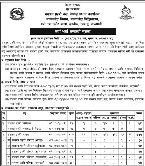 यसैगरी सशस्त्र प्रहरी परिचरतर्फ भान्छे २०, कुचिकार १९, सूचिकार १०, केशकर्तक २४ र चर्मकर्मी १४ जना भर्ना गर्न दरखास्त आह्वान गरेको छ।
