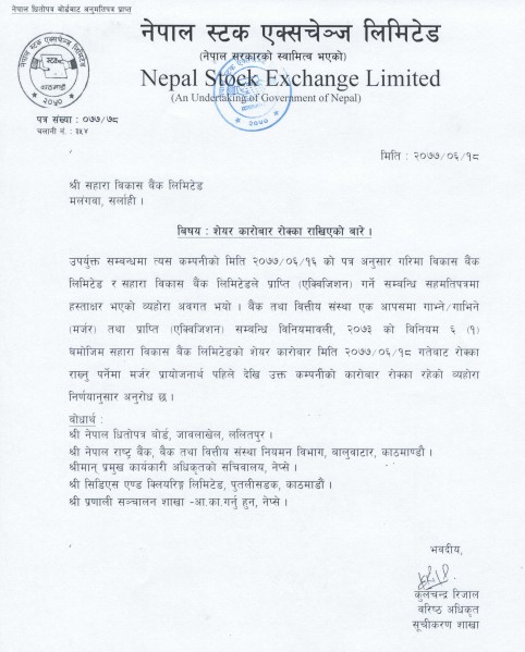 यी दुई बैंकबीच गत शुक्रवार एक्विजिसन सम्बन्धी सहमति पत्रमा हस्ताक्षर भएको थियो । अब सहारा विकास बैंकका लगानीकर्ताले एकीकृत कारोबारपश्चात् गरिमा विकासको नामबाट शेयर खरीदविक्री गर्न पाउनेछन् ।