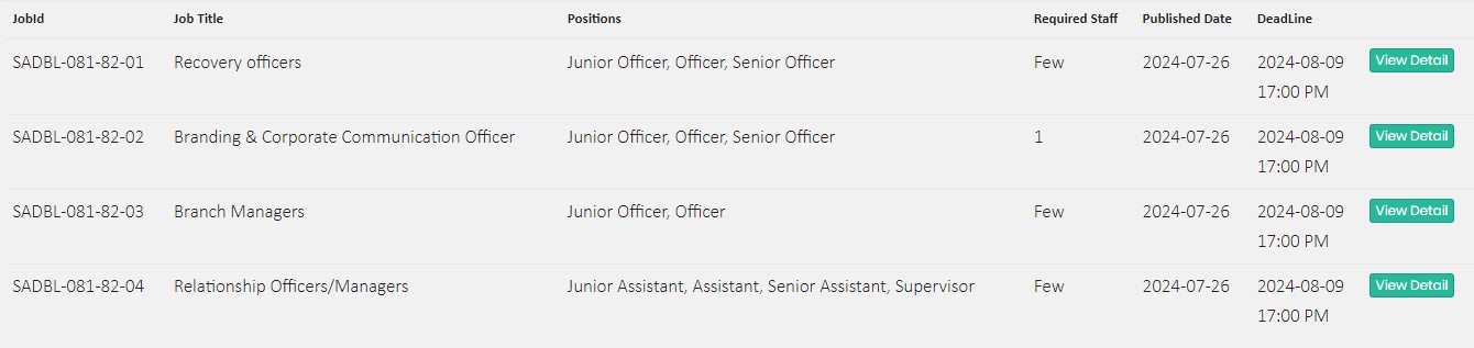कम्पनीले केन्द्रीय कार्यालय बालुवाटारका लागि एक जना ब्रान्डिङ एण्ड कर्पोरेट कम्युनिकेसन अफिसर पनि माग गरेको छ। काठमाडौं उपत्यकाका विभिन्न शाखा र रूपन्देही तथा सुर्खेत शाखाका लागि केही संख्यामा ब्रान्च म्यानेजर माग गरेको हो भने रिलेसनसिप अफिसर तथा म्यानेजरका लागि केहि संख्यामा कर्मचारी माग गरेको हो । इच्छुक तथा योग्यता पुगेका साउन २५ गतेसम्म आवेदन दिइसक्नुपर्नेछ ।