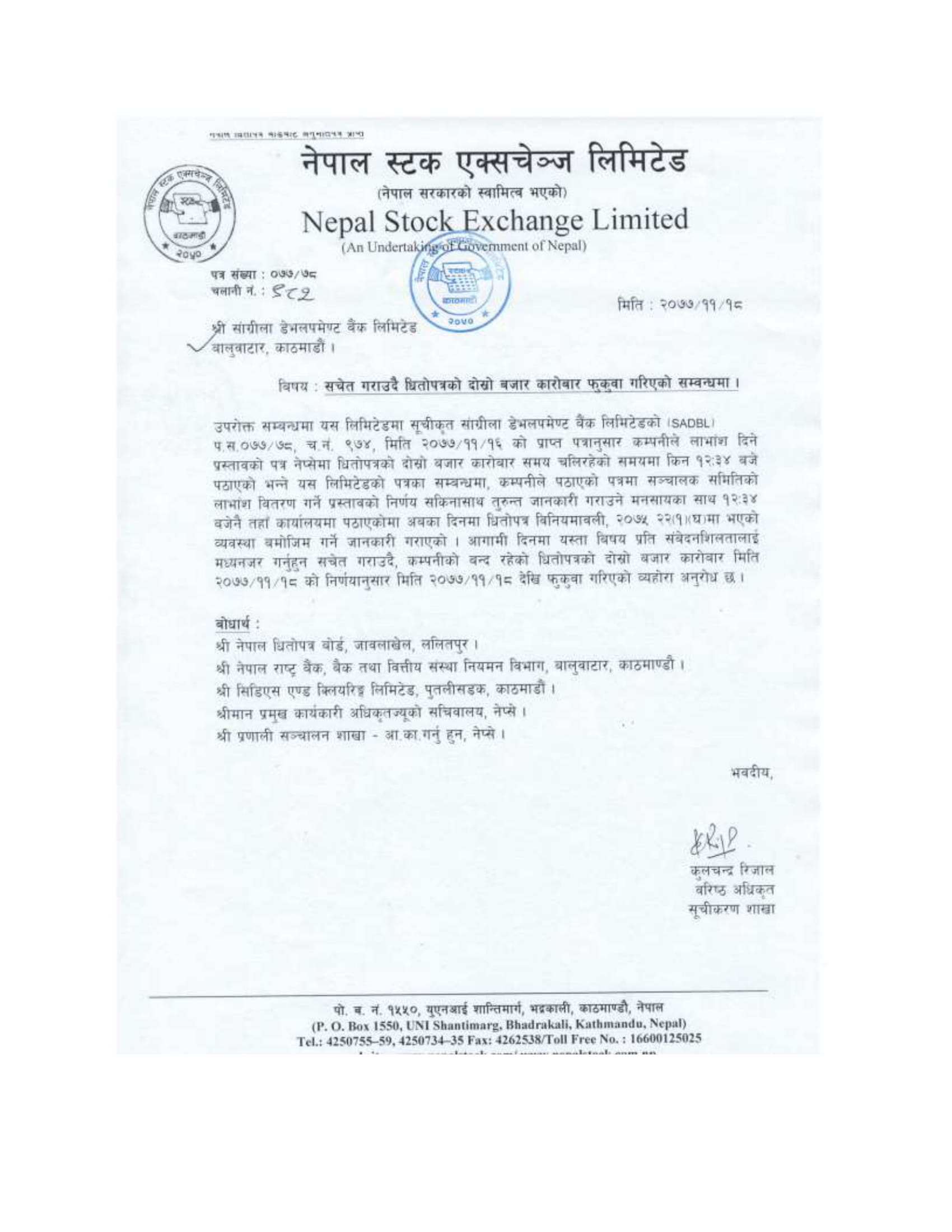 नेप्सेले यसअघि बैंकले लाभांश घोषणा गरेको सूचना कारोबार समयमा नै नेप्सेमा पठाएको भन्दै धितोपत्र सूचीकरण विनियमावली, २०७५ को विनियम २२(१) (घ) मा भएको व्यवस्था बमोजिम धितोपत्र मूल्यमा प्रभाव पार्ने, सूचना, जानकारी तथा निर्णय सिर्जना भएको सोही दिन अथवा भोलिपल्ट कारोबार खुल्नु अघि बुझाउनु पर्नेमा बैंकले उक्त व्यवस्था पालना नगरेको भनी कारोबार रोक्का गरेको थियो ।