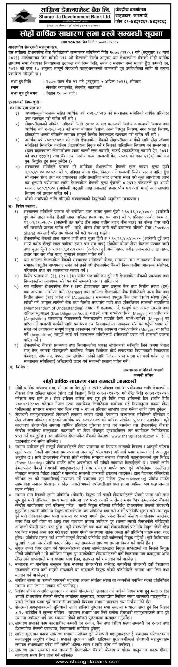 साथै, सभामा बैंकको सञ्चालक समितिको तर्फबाट अध्यक्षद्वारा आर्थिक वर्ष २०७६/७७ को वार्षिक प्रतिवेदनबारे छलफल गरी पारित गर्ने, आर्थिक वर्ष २०७६/७७ को लेखापरीक्षण प्रतिवेदन, वासलात, नाफा नोक्सान हिसाब र सोहि अवधिको नगद प्रवाह विवरण लगायतका वित्तिय विवरणहरू छलफल गरी पारित गर्ने, आर्थिक वर्ष २०७७/७८ को लागि लेखापरीक्षक नियुक्ती गरी पारिश्रमिक निर्धारण गर्ने लगायतका एजेन्डाहरू रहेका छन् ।