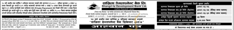 बैंकले १० वर्ष अवधिको ‘सांग्रिला डेभलपमेन्ट बैंक डिबेन्चर २०८७’ जारी गर्न लागेको हो । यसमा वार्षिक ९५ ब्याजदर रहनेछ । बिक्री प्रबन्धकमा एनआईबीएल एस क्यापिटल रहेको छ ।
