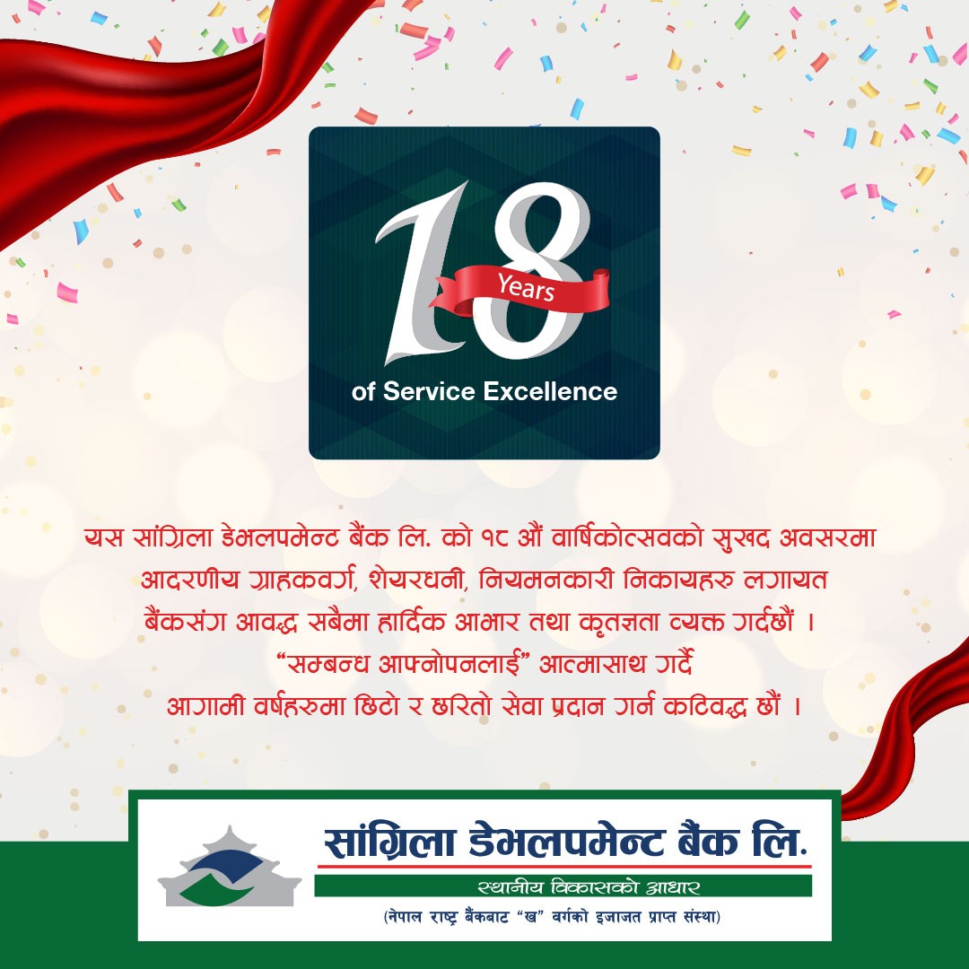 साग्रिला डेभलपमेन्ट बैकले आफ्ना ग्राहकवर्ग तथा शेयरधनीहरुको विश्वासले अलग्गै पहिचान बनाउन सफल भई आजको दिनमा आफ्नो कार्यकालको १८औं वार्षिकोत्सव उत्साहका साथ मनाउन सफल भएको छ ।