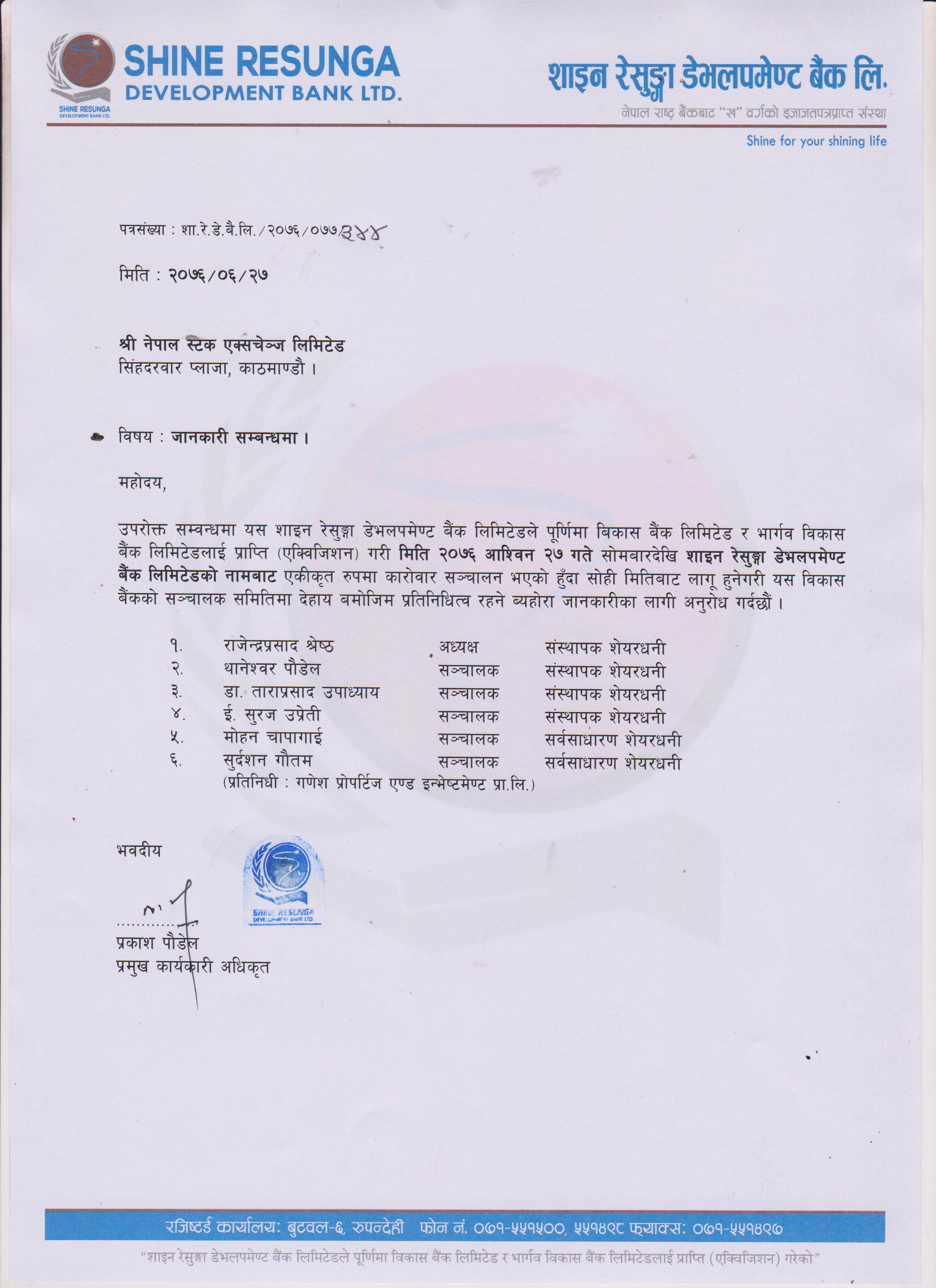 काठमाडौं । साइन रेसुङ्गा, पूर्णिमा र भार्गव विकास बैंकको आजबाट एकिकृत कारोबार शुरु भएको छ । शाइन रेसुङ्गा डेभलपमेन्ट बैंकले पूर्णिमा र भार्गवलाई एक्वायर गरी एकीकृत कारोबार समेत सुरु गरेको हो ।
