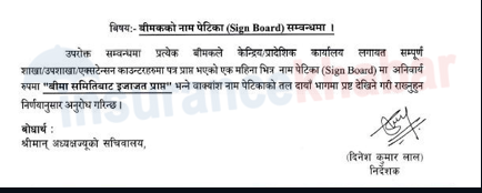 अब बाट प्रत्येक बीमकले केन्द्रिय /प्रादेशिक कार्यालय लगायत सम्पूर्ण शाखा/उपशाखा र एक्सटेन्सन काउन्टरहरुमा पत्र प्राप्त भएको एक महिनाभित्र साईन बोर्डमा अनिवार्य रुपमा बीमा समितिबाट इजाजत प्राप्त वाक्यांश राखी सक्न भनेको छ।