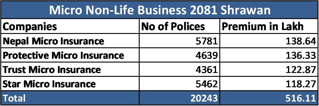 चालु आर्थिक वर्षको पहिलो महिनामा लघु निर्जीवन बीमकमध्ये नेपाल माइक्राले सर्वाधिक व्यापार गरेको छ। यो कम्पनीले ५ हजार ७८१ वटा बीमालेख जारी गर्दै १ करोड ३८ लाख ६४ हजार रुपैयाँ कुल बीमाशुल्क आर्जन गरेको छ।