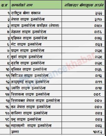 एशियन लाइफले ४३ करोड रुपैयाँ, मेट लाईफले ३५ करोड रुपैयाँ, राष्ट्रिय बीमा संस्थानले ३२ करोड रुपैयाँ, प्राइम लाइफले २९ करोड रुपैयाँ, सूर्या लाइफले २९ करोड रुपैयाँ, गुराँस लाइफले २९ करोड रुपैयाँ, यूनियन लाइफले २६ करोड रुपैयाँ, सिटिजन लाइफले १३ करोड रुपैयाँ, आइएमई लाइफले ११ करोड रुपैयाँ नविकरण बीमाशुल्क आर्जन गरेको छ ।