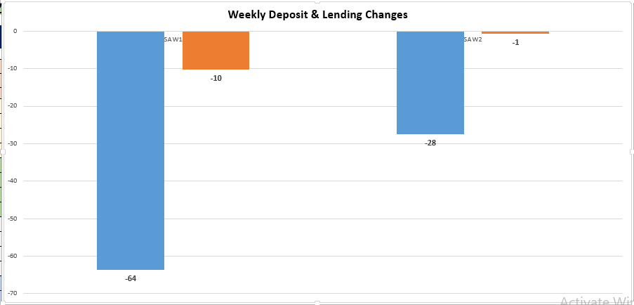 साउन १३ गतेसम्मको अवधिमा बाणिज्य बैंकहरुले ४३ खर्ब ४३ अर्ब रुपैयाँ निक्षेप संकलन गरेका छन् । जवकी असार मसान्तमा बाणिज्य बैंकहरुको निक्षेप संकलन ४४ खर्ब ३३ अर्ब रुपैयाँ थियो । त्यस्तै कर्जा प्रवाह तर्फ पनि गिरावट नै देखिन्छ । साउन १३ गतेसम्ममा ४१ खर्ब ६४ अर्ब रुपैयाँ कर्जा विस्तार गरेको छ । जवकी साउन दोस्रो सातासम्ममा ११ अर्बले कर्जा विस्तार खुम्चिएको छ ।