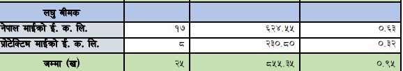 काठमाडौं । दुई निर्जीवन लघु बीमा कम्पनीहरुले साउन महिनामा कुल ९५ हजार रुपैयाँ कुल बीमा शुल्क आर्जन गरेका छन् । नेपाल बीमा प्राधिकरणको तथ्याङक अनुसार आर्थिक वर्ष २०८० /८१ को साउन महिनामा नेपाल माइक्रो इन्स्योरेन्स कम्पनीले ६३ हजार बीमा शुल्क आर्जन गरेको छ । उक्त विवरण अनुसार यस कम्पनीले १७ वटा बीमा लेख विक्री गरी ६३ हजार रुपैयाँ कुल बीमा शुल्क आर्जन गर्न सफल भएको हो । यस कम्पनीले असार २८ गते भरतपुर केन्द्रिय कार्यालय विस्तार गरी व्यवसाय संचालन गर्दै आइरहेको छ ।