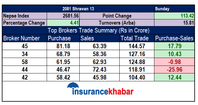 १५ अर्ब ८१ करोड रुपैयाँको कारोबार भएको दिन ब्रोकर नम्बर ४५ बाट सर्वाधिक रकमको कारोबार भएको छ। ब्रोकर नम्बर ४५ बाट १ अर्ब ४४ करोड ५७ लाख रुपैयाँको कारोबार भएकोमा ८१ करोड १८ लाख रुपैयाँको खरिद छ भने ६३ करोड ३९ लाख रुपैयाँको बिक्री भएको छ।