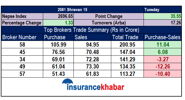 १७ अर्ब २६ करोड कारोबार भएको दिन ब्रोकर नम्बर ५८ बाट सर्वाधिक रकमको कारोबार भएको छ ।