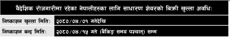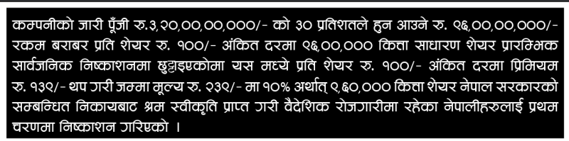 काठमाडौं । सन नेपाल लाइफ इन्स्योरेन्स कम्पनीले जारी पूँजी रू. ३ अर्ब २० करोडको ३० प्रतिशतले हुन आउने ९६ लाख कित्ता साधारण शेयर प्रारम्भिक सार्वजनिक निष्कासनमा छुट्टाएकोमा यसमध्ये प्रति शेयर रू. १०० अंकित दरमा प्रिमियम रु. १३९ थप गरी जम्मा मूल्य रू. २३९ मा १० प्रतिशत अर्थात् ९ लाख ६० हजार कित्ता शेयर नेपाल सरकारको सम्बन्धित निकायबाट श्रम स्वीकृति प्राप्त गरी वैदेशिक रोजगारीमा रहेका नेपालीहरूलाई प्रथम चरणमा साउन १ गतेदेखि आईपीओ निष्कासन गर्नेछ ।
