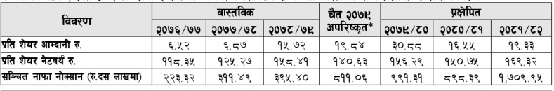 आर्थिक वर्ष ७८/७९ को वास्तविक वार्षिक तथ्यांक अनुसार कम्पनीको प्रति शेयर आम्दानी १५ रुपैयाँ ७२  पैसा रहेको छ भने किताबी मूल्य १५८ रुपैयाँ ४१ पैसा छ । आ.व. ७९/८० को चैत मसान्तसम्मको अपरिष्कृत विवरण अनुसार कम्पनीको प्रति शेयर आम्दानी १९ रुपैयाँ ८४ पैसा र किताबी मूल्य १४० रुपैयाँ ६३ पैसा रहेको छ ।