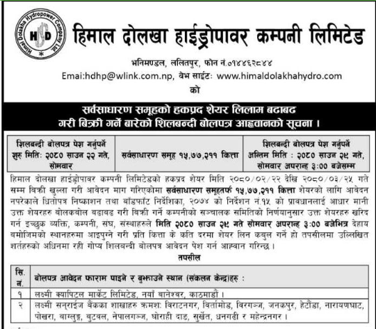 काठमाडौं । हिमाल दोलखा हाइड्रोपावरले सर्वसाधारण समुहको हकप्रद शेयर लिलामी मार्फत विक्री गर्ने भएको छ । कम्पनीले जेठ २२ गतेदेखि असार २५ गतेसम्म सर्वसाधारण समुहको शेयर विक्री खुला गरी आवेदन माग गरेकोमा १५ लाख ७७ हजार २११ कित्ताका लागि आवेदन नपरेकाले लिलामीमा बिक्री गर्न लागेको हो ।