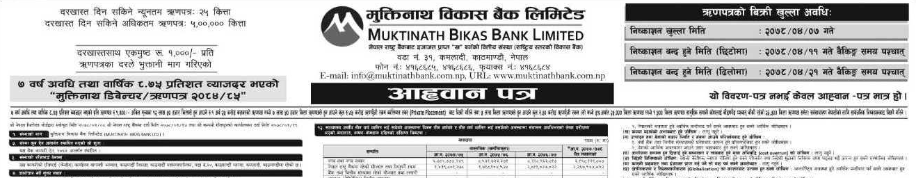 बैंकले ७ वर्ष अवधिको ८.७५ प्रतिशत व्याजदर भएको ‘मुक्तिनाथ डिबेञ्चर २०८४/८५’ नाममा ऋणपत्र निष्काशन गर्न लागेको हो । ऋणपत्र निष्काशन तथा बिक्री प्रबन्धकमा सानिमा क्यापिटल लिमिटेड रहेको छ ।