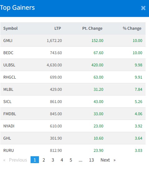 आज सबेभन्दा धेरै गार्डियन माइक्रो लाइफ र भुगोल इनर्जीका लगानीकर्ताले कमाएका छन् । आज यी दुई कम्पनीका लगानीकर्ताले १० प्रतिशतका दरले कमाएका हुन् । गार्डियन माइक्रो लाइफको शेयर दोस्रो बजारमा कारोबारमा आएकै दिनबाट लगातार सकारात्मक सर्किट लागिरहेको छ । उपकार लघुवित्त वित्तीय संस्थाका लगानीकर्ताले ९ दशलमव ९८ प्रतिशतका दरले कमाएका छन् । राप्ती हाइड्रोका लगानीकर्ताले ९ दशलमव ९१ प्रतिशतका दरले कमाएका हुन् ।