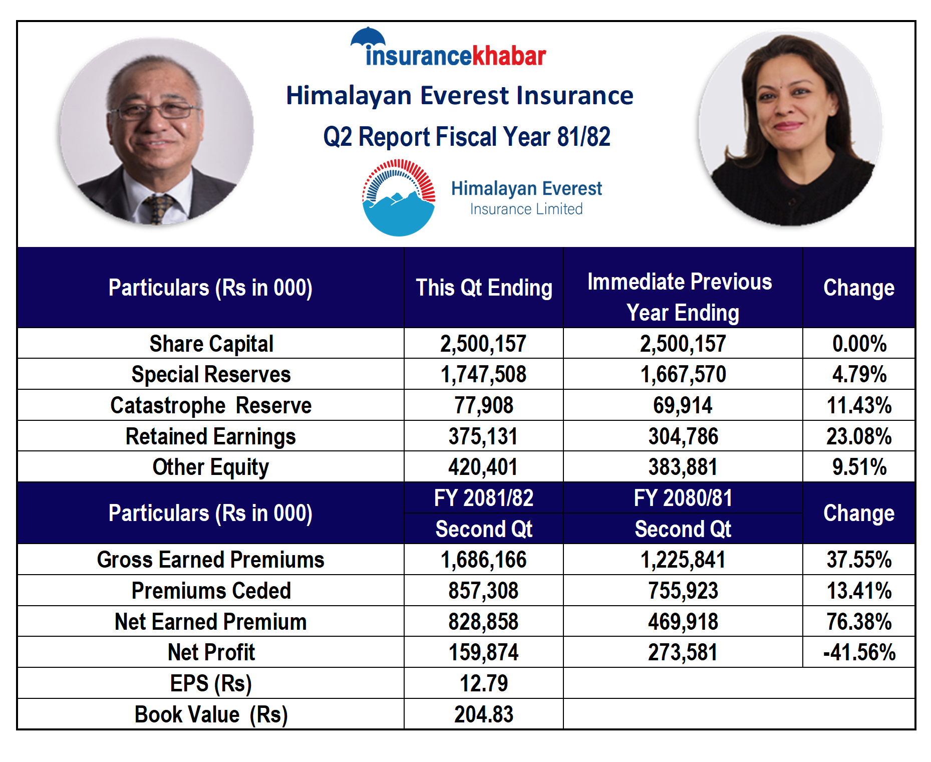 काठमाडौं । हिमालयन एभरेष्ट इन्स्योरेन्स लिमिटेडले चालु आर्थिक वर्ष २०८१।८२ को दोश्रो त्रैमासको वित्तीय विवरण प्रकाशन गरेको छ ।