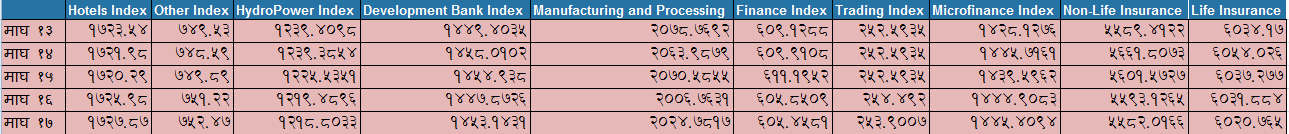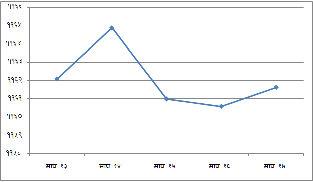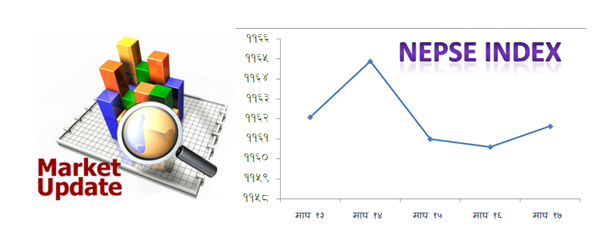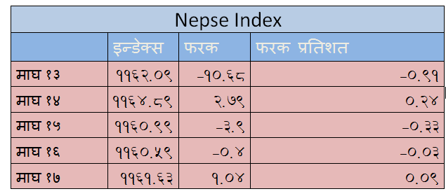 यो साता ५ दिन मध्य ३ कारोवार दिन नेप्से परिसूचक घटेको भएको थियो भने २ कारोवार दिन नेप्से परिसूचक सामान्य अंकले वृद्धि भएको थियो ।