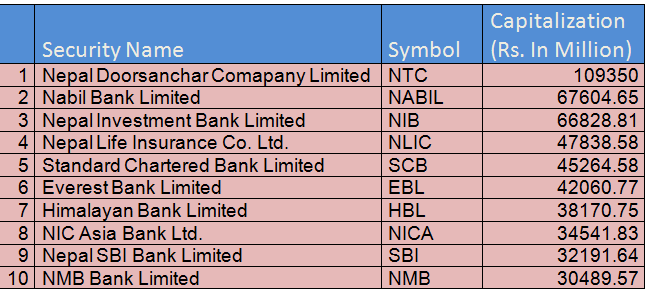 आजको मिति सम्म सबै भन्दा ठुलो बजार पुँजीकरण भएको कम्पनीमा नेपाल टेलिकम परेको छ । दोश्रोमा नबिल बैंक लिमिटेड र तेश्रोमा नेपाल इन्भेस्टमेन्ट बैंक रहेको छ ।