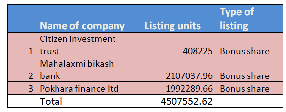 यो साता नागरिक लगानीकोष, महालक्ष्मी विकास बैंक र पोखरा फाईनान्सको गरेर बोनस शेयर ४५ लाख ७ हजार ५ सय ५२ कित्ता शेयर सुचिकृत भएका छ ।