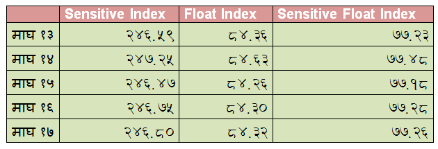 यो साता ५ दिन मध्य ३ कारोवार दिन नेप्से परिसूचक घटेको भएको थियो भने २ कारोवार दिन नेप्से परिसूचक सामान्य अंकले वृद्धि भएको थियो ।