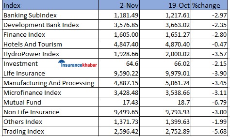 यस साता होटल एण्ड टुरिजम र उत्पादनमुलक उपसमूहको परिसूचक बाहेक सबै उपसूचक घटेका छन् । गत साताको तुलनामा यस साता बैंकिङ उपसमूहको परिसूचक २ दशलमव ९७ प्रतिशते घटेको छ । विकास बैंक उपसमूहको परिसूचक २ दशलमव ३५ प्रतिशतले घटेको छ । फाइनान्स उपसमूहको परिसूचक २ दशलमव ८० प्रतिशतले घटेको छ ।