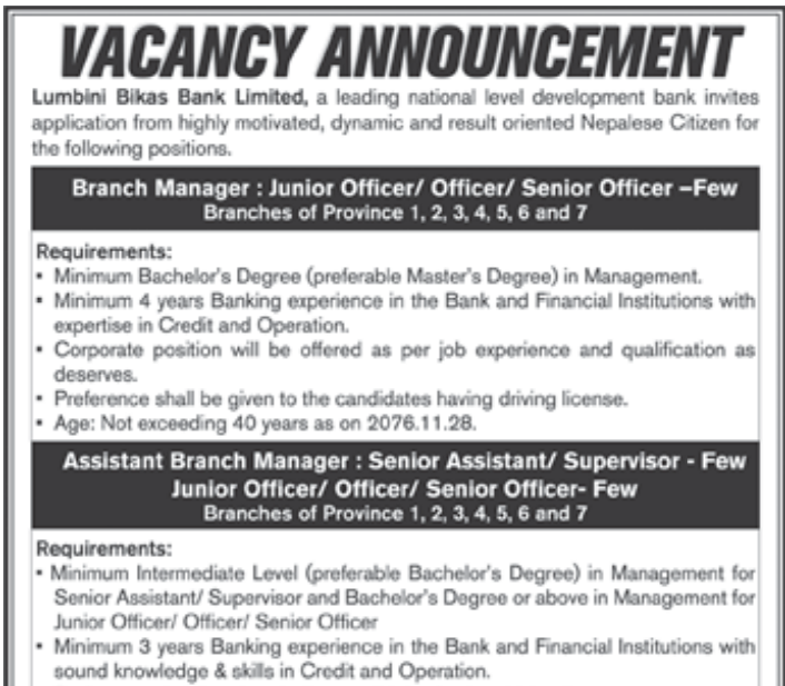 काठमाडौं । लुम्बिनी विकास बैंकले विभिन्न पदका लागि कर्मचारीको माग गरेको छ । बैंकले ब्रान्च म्यानेजर,जूनियर अफिसर, अफिसर, सिनियर अफिसरका लागि केही कर्मचारी, असिस्टेन्ट ब्रान्च म्यानेजर,सिनियर असिस्टेन्ट, जुनियर अफिसर, अफिसर,सिनियर अफिसर र सुपरभाइजरका लागि केही संख्यामा कर्मचारीको माग गरेको जनाएको छ ।