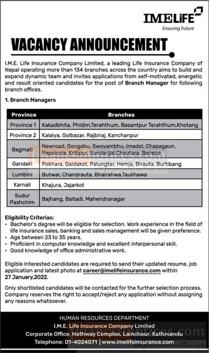 काठमाडौं । आइएमई लाइफ इन्स्योरेन्स कम्पनी लिमिटेडले ब्रान्च म्यानेजरका लागि सातै प्रदेशमा कर्मचारीको माग गरेको छ । कम्पनीले प्रदेश नं। १ अन्तर्गत काँकडभित्ता, फिदिम, तेह्रथुम, बसन्तपुर तेह्रथुम, खोटाङ ब्रान्चका लागि, प्रदेश नं। २ अन्तर्गत कलैया, गोलबजार राजबिराज र कंचनपुर शाखाका लागि, बागमती प्रदेशका लागि न्यूरोड, गोङ्गबु, स्वयम्भू, इमाडोल, चापागाउँ, पेप्सिकोला, कीर्तिपूर, सुन्दरीजल, चौतारा र बनेपा ब्रान्चका लागि केही कर्मचारीको माग गरेको हो ।