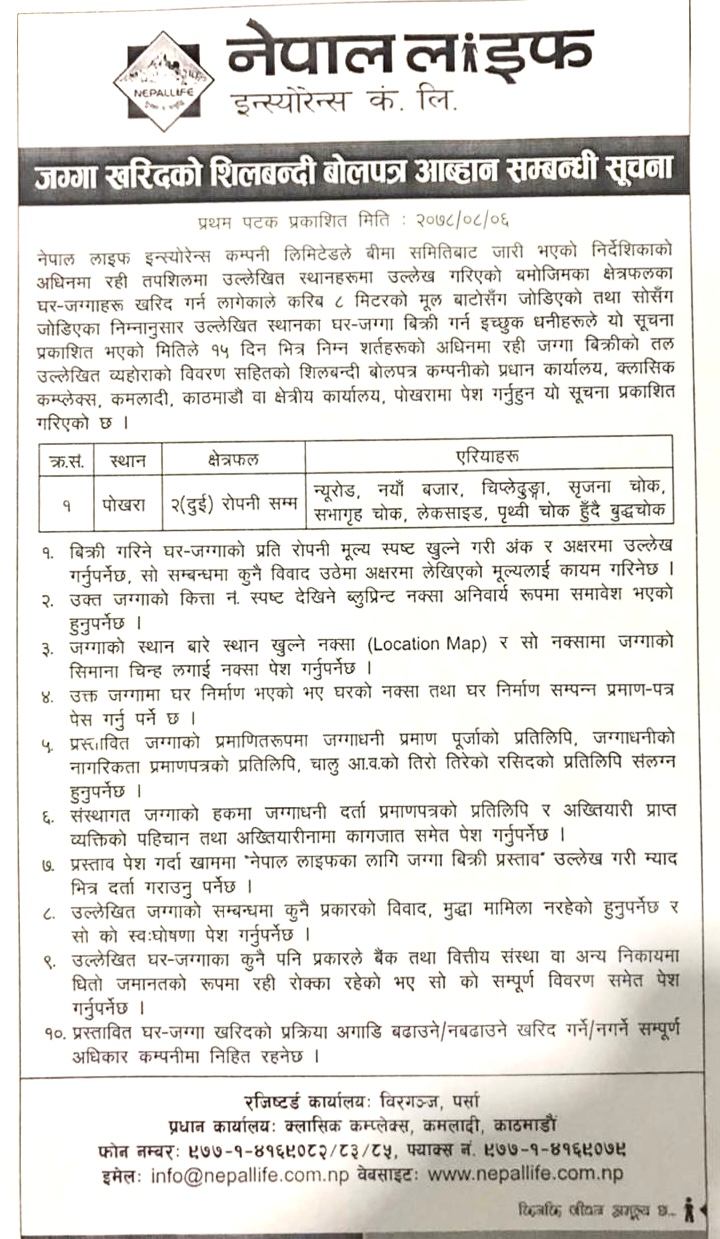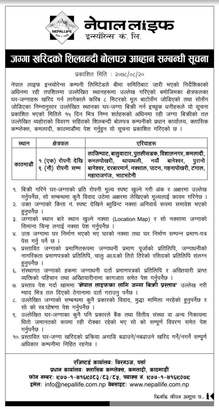 कम्पनीले केन्द्रिय कार्यालयका लागि काठमाडौंमा न्युनतम एक रोपनीदेखि अधिकतम ९ रोपनी सम्मको जग्गा खरिदका लागि शिलबन्दी बोलपत्र आह्वान गरेको छ । नेपाल लाइफले लाजिम्पाट, बालुवाटार, पुतलीसडक, विशालनगर, कमलादी, कमलपोखरी, थापाथली, नयाँ बानेश्वर, पुनारो बानेश्वर, दरबारमार्ग, नक्साल, पाटन, गहनापोखरी, टंगाल, महाराजगंज र भाटभनेनीमा मुलबाटोबाट ८ मिटरको दुरिमा रहेका जग्गाधनीहरुले प्रस्ताव पेश गर्न सक्ने छन् । जग्गाधनीले आजको १५ दिन भित्रमा प्रस्ताव पेश गर्न पाउने कम्पनीले जनाएको छ ।