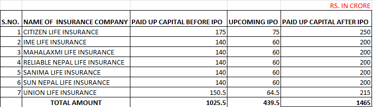 आईपिओ जारी भएपछि सानिमा लाइफ इन्स्योरेन्स कम्पनी, रिलायवल नेपाल लाइफ इन्स्योरेन्स कम्पनी, आईएमई लाइफ इन्स्योरेन्स कम्पनी ,महालक्ष्मी लाइफ इन्स्योरेन्स कम्पनी र सन नेपाल लाइफ इन्स्योरेन्स कम्पनीको चुक्ता पूँजी २ अर्ब पुग्नेछ । त्यसैगरी सिटिजन लाईफ इन्स्योरेन्स कम्पनीको २ अर्ब ५० करोड र युनियन लाईफ इन्स्योरेन्स कम्पनीको २ अर्ब १५ करोड रुपैयाँ चुक्ता पूँजी पुग्नेछ ।