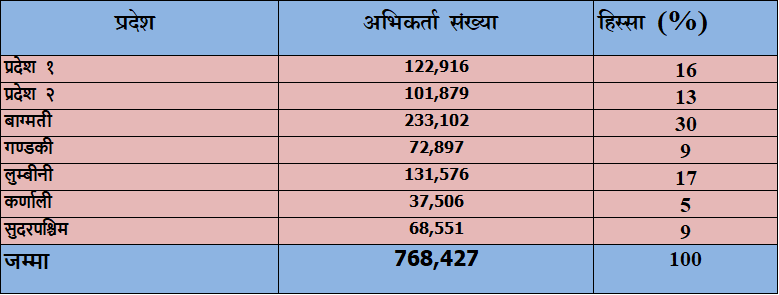 त्यस्तै दोस्रो धेरै अभिकर्ता लुम्बीनी प्रदेशमा रहेका छन् । समितिका अनुसार यस प्रदेशमा एक लाख ३१ हजार ५७५ जना रहेका छन् । यस प्रदेशमा १७ प्रतिशत अभिकर्ता रहेका छन् । प्रदेश नम्बर एकमा पनि एक लाख २२ हजार ९१६ जना अभिकर्ता छन् । जसको हिस्सा १६ प्रतिशत छ ।