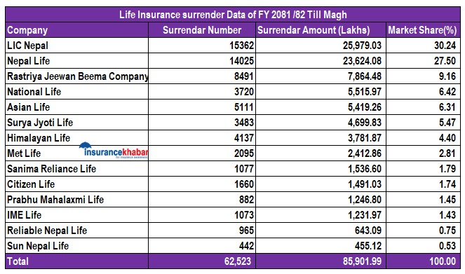 सिटिजन लाइफको १६ सय ६० वटा बीमा पोलिसी वापत १४ करोड ९१ लाख रुपैयाँको पोलिसी सरेन्डर भएको हो । प्रभु महालक्ष्मी लाइफको ८८२ वटा बीमा पोलिसी वापत १२ करोड ४६ लाख रुपैयाँको पोलिसी सरेण्डर भएको हो । आइएमई लाइफको १ हजार ७३ वटा बीमा पोलिसी वापत १२ करोड ३१ लाख रुपैयाँको पोलिसी सरेन्डर भएको हो । रिलायबल नेपाल लाइफको ९६५ वटा बीमा पोलिसी वापत ६ करोड ४३ लाख रुपैयाँको पोलिसी सरेन्डर भएको हो । सन नेपाल लाइफको ४४२ वटा बीमा पोलिसी वापत ४ करोड ५५ लाख रुपैयाँको पोलिसी सरेन्डर भएको हो ।
