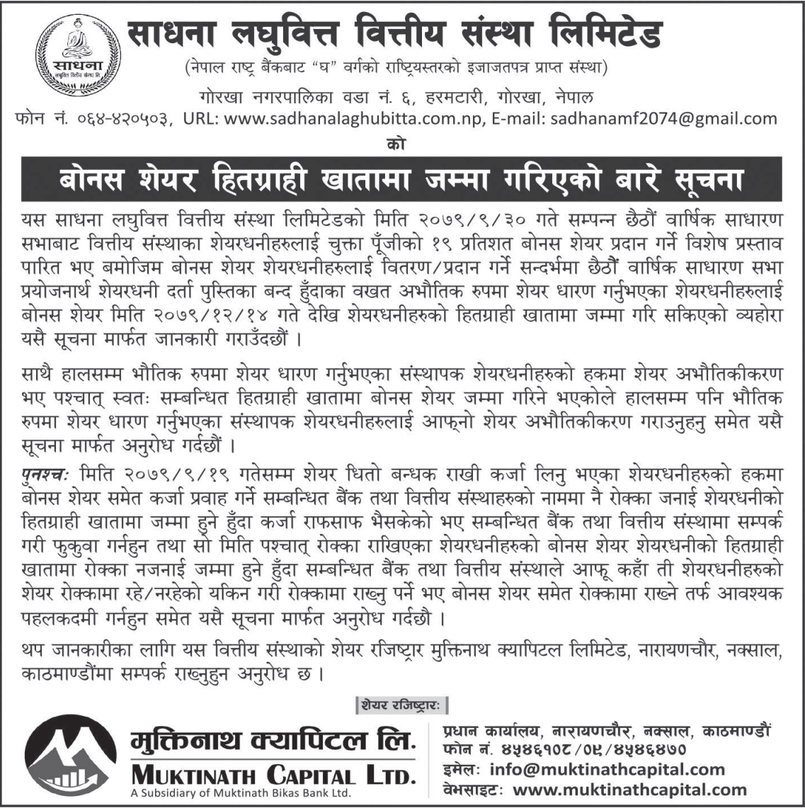 काठमाडौं । साधना लघुवित्त वित्तीय संस्था लिमिटेडले गत आर्थिक वर्ष २०७८र०७९ को लाभांश वितरण गर्न शुरु गरेको छ । कम्पनीले गत पुस ३० गते सम्पन्न छैटौं वार्षिक साधारण सभाबाट पारित १९ प्रतिशत बोनश शेयर सम्बन्धित शेयरधनीहरूको हितग्राही खातामा चैत १४ गतेदेखि जम्मा गर्न शुरु गरेको जनाएको छ ।