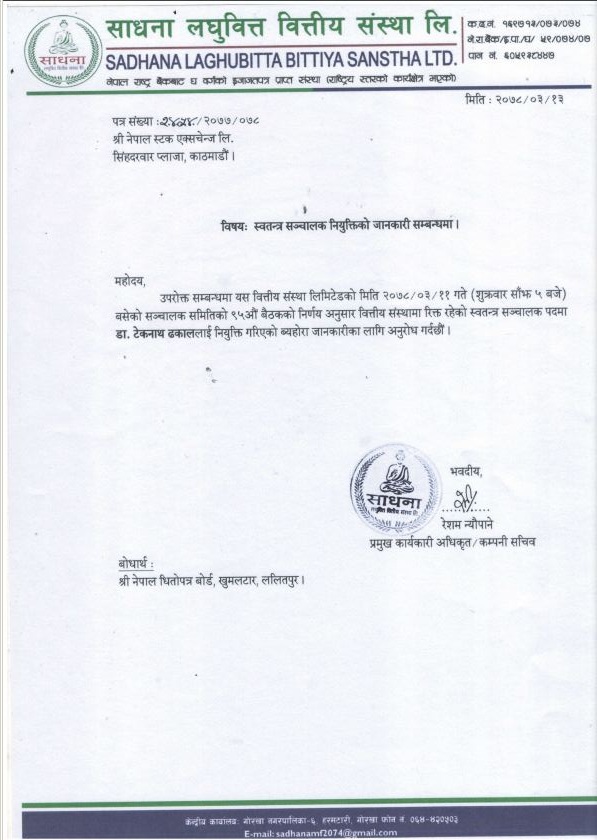 काठमाडौं । साधना लघुवित्त वित्तीय संस्था लिमिटेडको स्वतन्त्र संचालकमा डा. टेकनाथ ढकाल नियुक्त भएका छन् । संस्थाको संचालक समितिको असार ११ गते शुक्रबार बसेको बैठकले ढकाललाई रिक्त रहेको स्वतन्त्र संचालक पदमा ढकाललाई नियुक्त गरेको हो ।