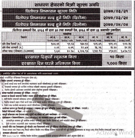 उक्त आइपीओलाई इक्रा नेपाल लिमिटेडले ग्रेड ४ रेटिङ दिएको छ ।संस्थाले सर्वसाधारणलाई शेयर जारी गरेपछि ५० प्रतिशत हकप्रद बिक्री गर्ने योजना बनाइएको कम्पनीको भनाई छ ।