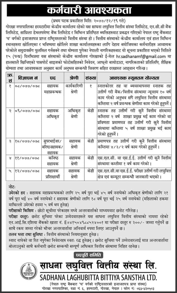 काठमाडौं । साधना लघुवित्त लघुवित्तले विभिन्न पदका लागि कर्मचारीको माग गरेको जनाएको छ । कम्पनीले सहायक महाप्रबन्धकका लागि १ जना, सहायक अधिकृतका लागि केही, सुपरभाइजरका लागि केही, कनिष्ठ सहायकका लागि केही र प्रशिक्षार्थीका लागि केही संख्यामा कर्मचारीको माग गरेको हो ।
