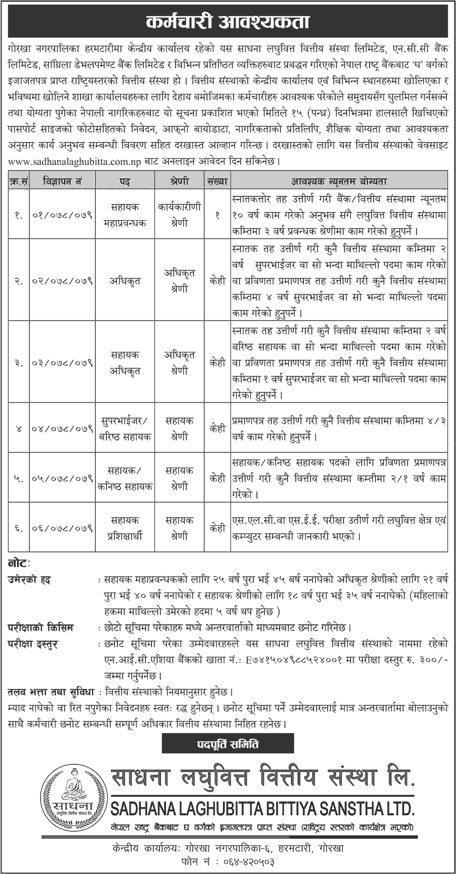 काठमाडौं । साधना लघुवित्त वित्तीय संस्थाले विभिन्न पदको लागि कर्मचारीको माग गरेको छ । संस्थाले सहायक महाप्रबन्धकका लागि १ जना, अधिकृतका लागि केही, सहायक अधिकृतका लागि केही, सुपर भाइजर तथा वरिष्ठ सहायकका लागि केही, सहायक कनिष्ठ सहायकका लागि केही, र सहायक प्रशिक्षार्थीका लागि केही कर्मचारीको माग गरेको छ ।
