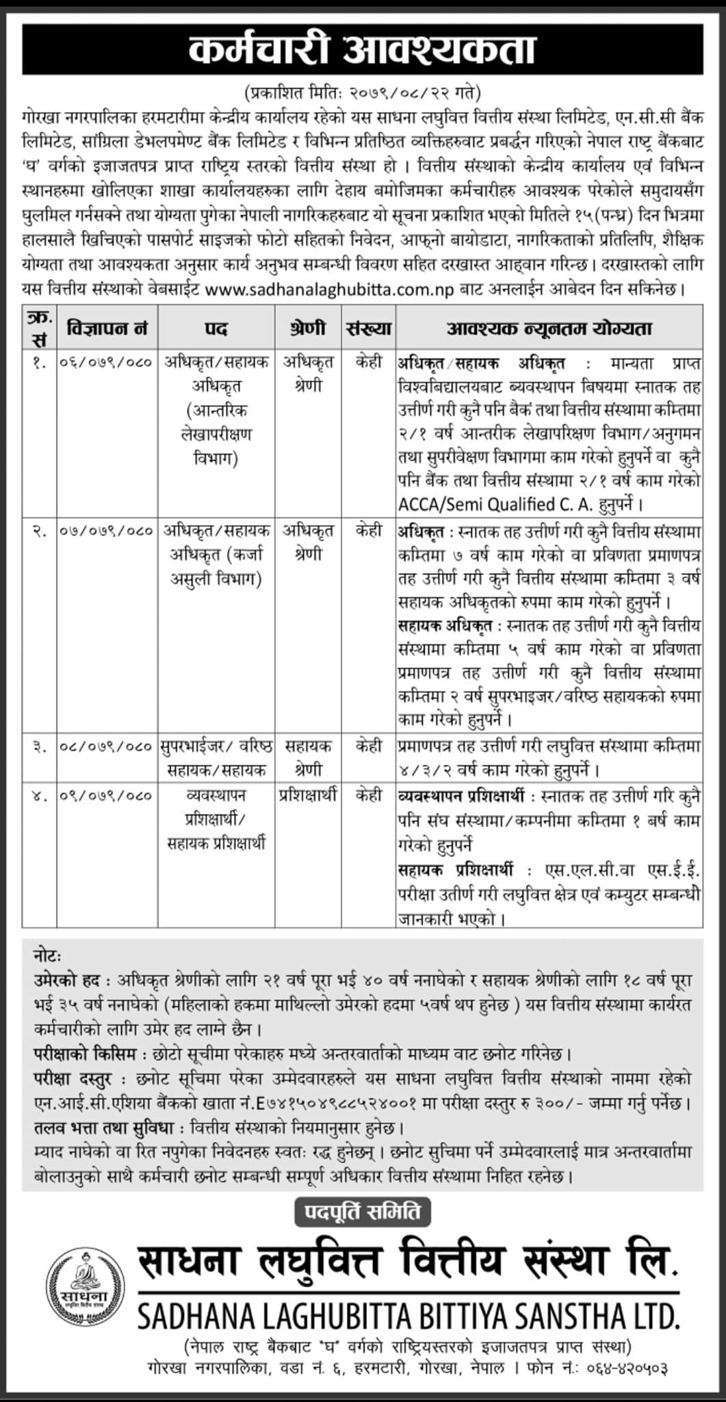 काठमाडौं । साधना लघुवित्त वित्तीय संस्था लिमिटेडले विभिन्न पदका लागि कर्मचारीको माग गरेको छ । संस्थाले आन्तरिक लेखापरिक्षण विभाग अन्तर्गत अधिकृत र सहायक अधिकृतका लागि केही, कर्जा असुली विभागमा अधिकृत र सहायक अधिकृतका लागि केही, सुपरभाईजरमा वरिष्ठ सहायक, सहायकका लागि केही र व्यवस्थापन प्रशिक्षार्थीका लागि केही संख्यामा कर्मचारीको माग गरेको छ ।
