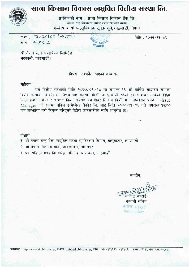 कम्पनीको फागुन ६ गते बसेको सञ्चालक समितिको बैठकले उक्त निर्णय गरेको संस्थाले एक सुचना जारी गर्दै नेप्सेमा जनाएको हो ।