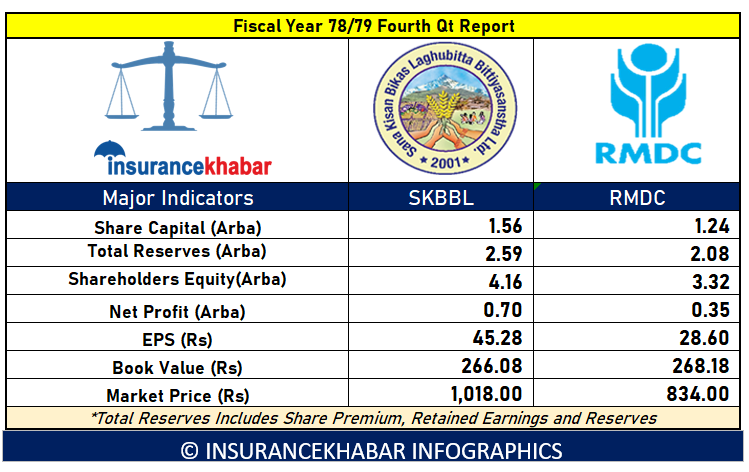 गत आर्थिक वर्ष ७८/८९को चौथो त्रैमासको आधारमा साना किसान लघुवित्त वित्तीय सस्थाको चुक्ता पुँजी १ अर्ब ५६ करोड छ भने आरएमडिसीको चुक्ता पुँजी १ अर्ब २४ करोड छ । संचित नाफा सहितको जगेडाकोषमा साना किसानको २ अर्ब ५९ करोड संचित हुँदा आरएमडिसीको २ अर्ब ८ करोड संचित छ।