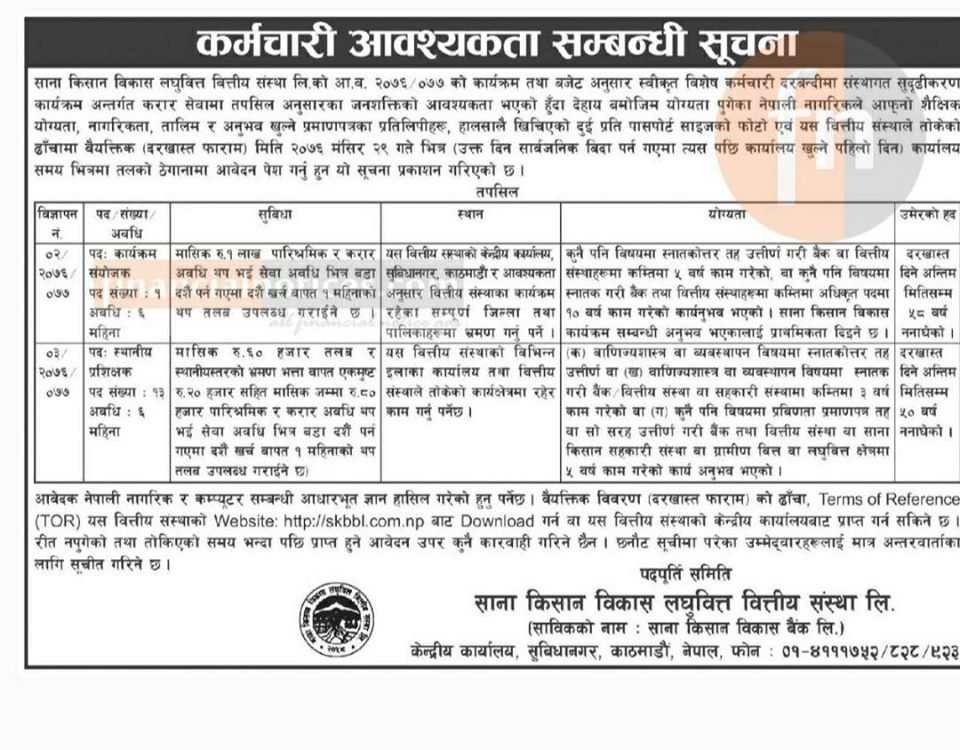 संस्थाले विभिन्न शाखा कार्यालयका लागि कर्मचारीको माग गरेको जनाएको छ । ईच्छुक तथा योग्यता पुगेकाले मंसिर २९ गतेभित्र आवेदन दिइसक्नुपर्ने संस्थाले जनाएको छ ।