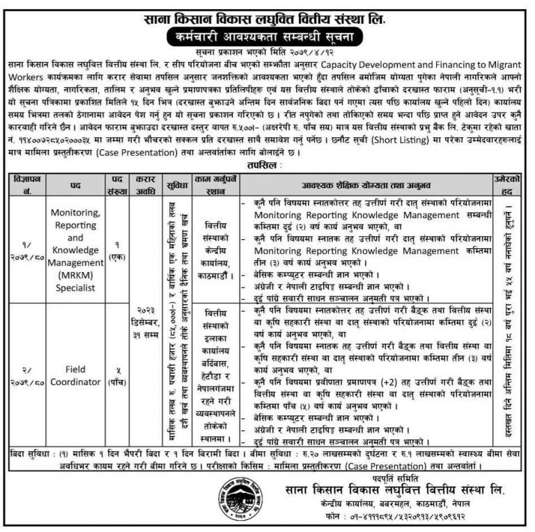 काठमाडौं । साना किसान विकास लघुवित्त वित्तीय संस्था लिमिटेडले दुई पदका लागि कर्मचारीको माग गरेको छ । लघुवित्तले व्यवस्थापनका लागि १ जना र फिल्ड कोर्डिनेटरमा ५ जनाका लागि कर्मचारीको माग गरेको हो । कम्पनीले उक्त पदहरुका लागि न्युनतम प्लस टु उत्तिर्ण देखि स्नाकोत्तर उत्तिर्ण सम्मको शैक्षिक योग्यता हुनुपर्ने बताएको छ ।