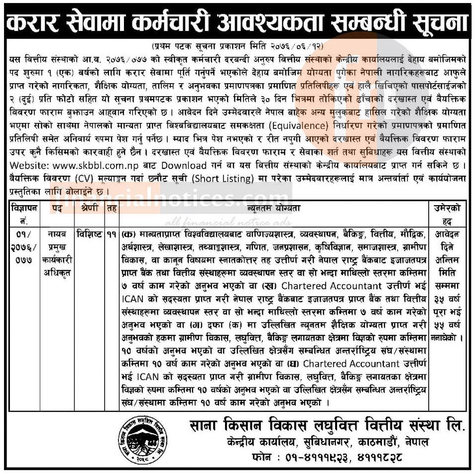 काठमाडौँ । साना किसान विकास लघुवित्त वित्तीय संस्था लिमिाटेडले करार सेवामा कर्मचारी माग गरेको छ । संस्थाले करार सेवाका लागि नायव प्रमुख कार्यकारी अधिकृत माग गरेको हो ।