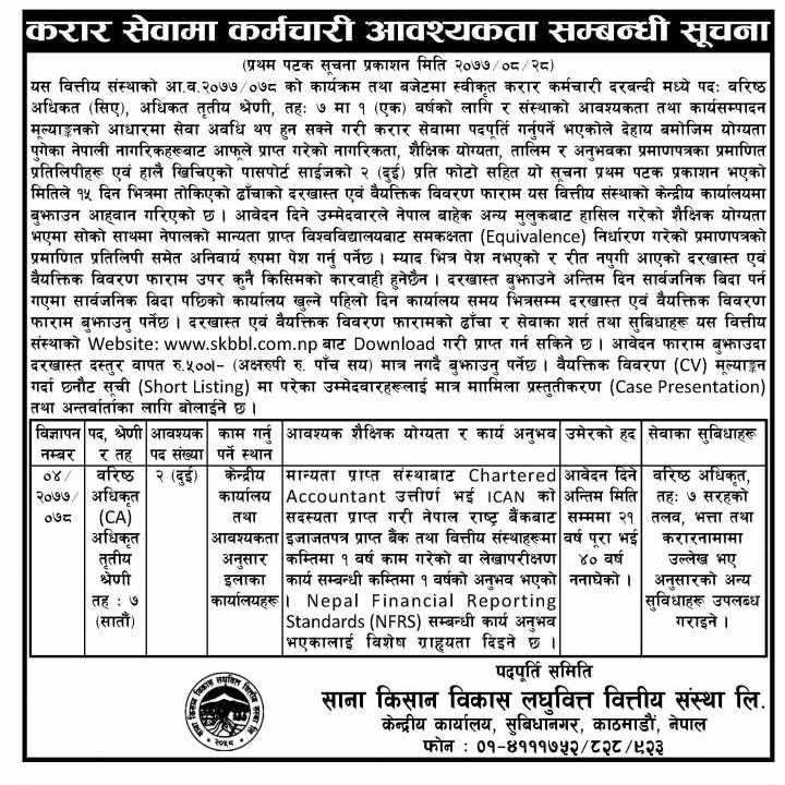 काठमाडौँ । साना किसान विकास लघुवित्त वित्तीय संस्था लिमिटेडले कर्मचारीको माग गरेको छ । संस्थाले वरिष्ठ अधिकृत र अधिकृत तृतीय श्रेणीका लागि कर्मचारीको माग गरेको हो ।